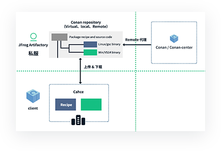 基于Artifactory快速搭建Conan 私服,代理 Conan 社区中常见C/C++ 模块,同时企业自 研发组件可以快速上传到企业Conan私服, 快速在多团队间共享组件。提高开发效率。