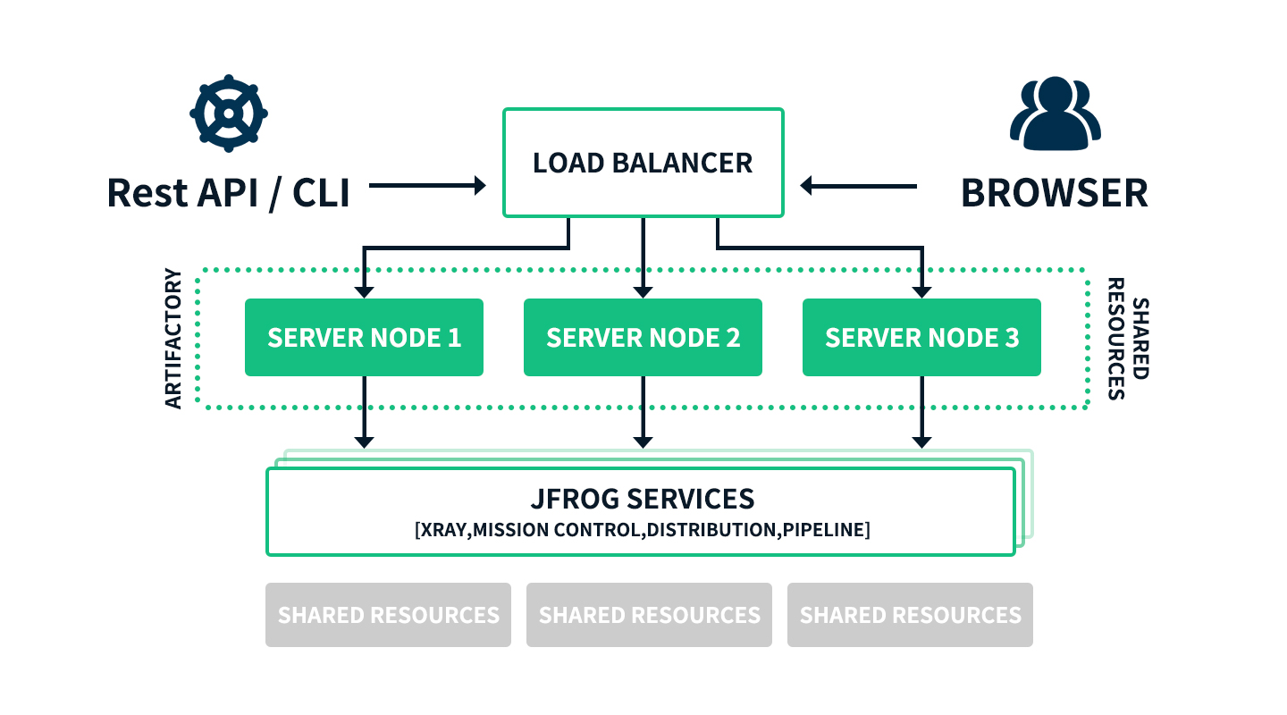 集群架构采用Active-Active模式。 负载均衡是 JFrog 平台的入口,并分发并发 请求到集群内,提高并发能力。集群内每个 节点都可以进行读写操作,另外仅需对 Arti- factory 服务做负载均衡作为服务统一入 口,它会对集群内的其它服务路由并调度。 当负载均衡为 Nginx 时,可提供如 backup, 轮询,最小链接等调度策略。