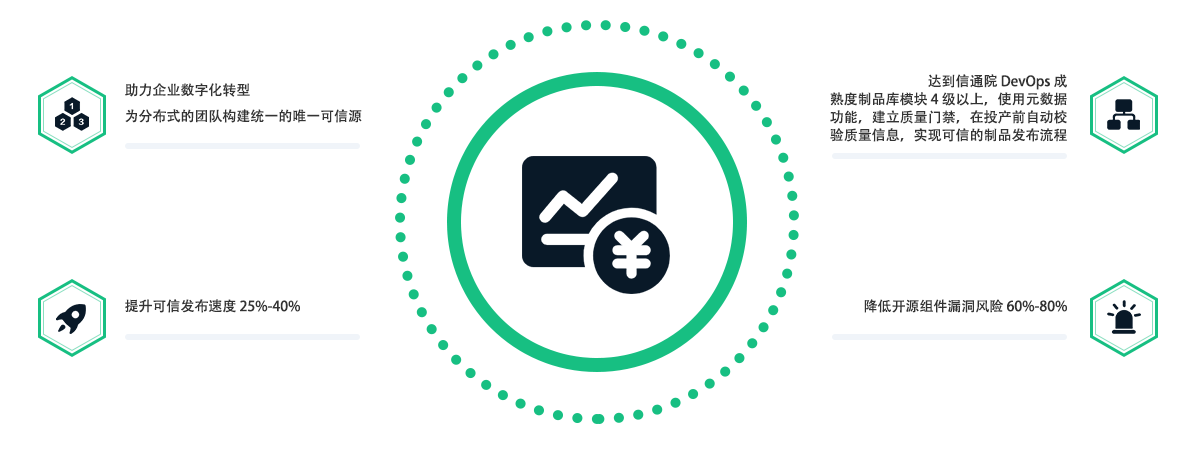 很多企业仍然使用 FTP 进行 war 包,zip 等交付包的管理,这样会导致交付包缺失 信息,版本管理的配置变更在哪,版本是否通过了代码扫描,漏洞扫描,自动化测 试和测试团队的 Approve?这些信息的缺失会导致沟通成本急剧上升,造成人力和 时间的大量浪费。随意获取有漏洞的依赖库,或者使用违反公司 License策略的依 赖包,也会给公司带来直接损失。如果没有唯一可信源,各个团队,特别是分布在 多个地区的开发团队将花费大量的时间在配置变更,版本传递和部署上。